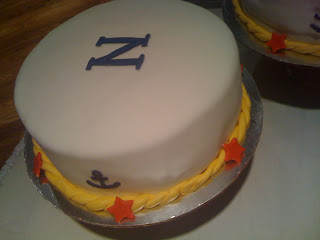 This is a grooms cake. It is a set of 4 cakes that spells out NAVY. Each cake was covered in fondant with a fondant rope, anchors, and stars. Two cakes were chocolate with ganache filling, and two were white with raspberry filling.